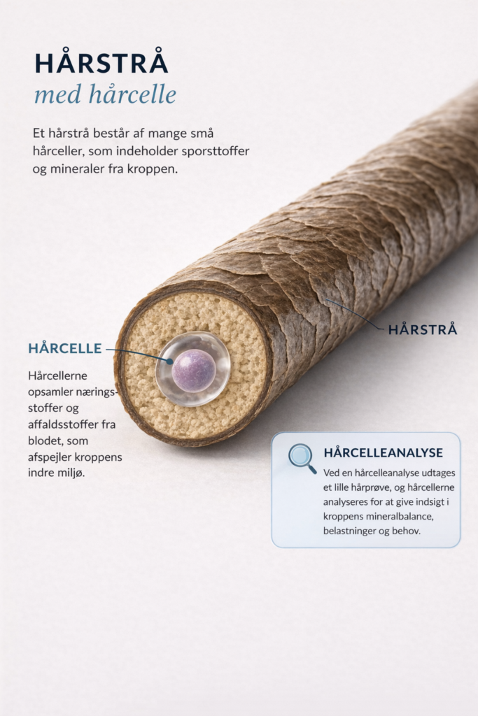 Hårcelleanalyse er en metode, hvor man analyserer 3-4 stk. hår med rod dvs. levende celler for at få indsigt i kroppens biologiske tilstand.